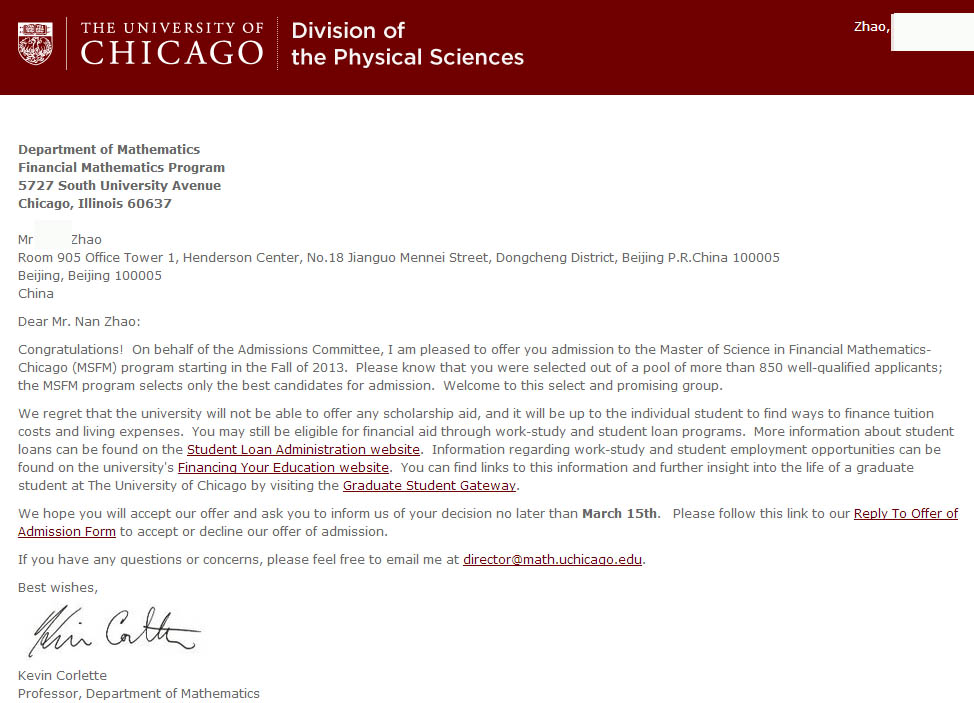 我们不杜撰名校案例,只展示出最真实的录取。下面是赵同学的芝加哥录取信: