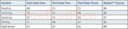 可以看出,这位考生最高的阅读成绩来自第一次考试,最高的写作成绩来自第二次考试,听力和口语的最高成绩来自第三次考试,于是这四者结合后这位托福考生的拼分成绩为90分。