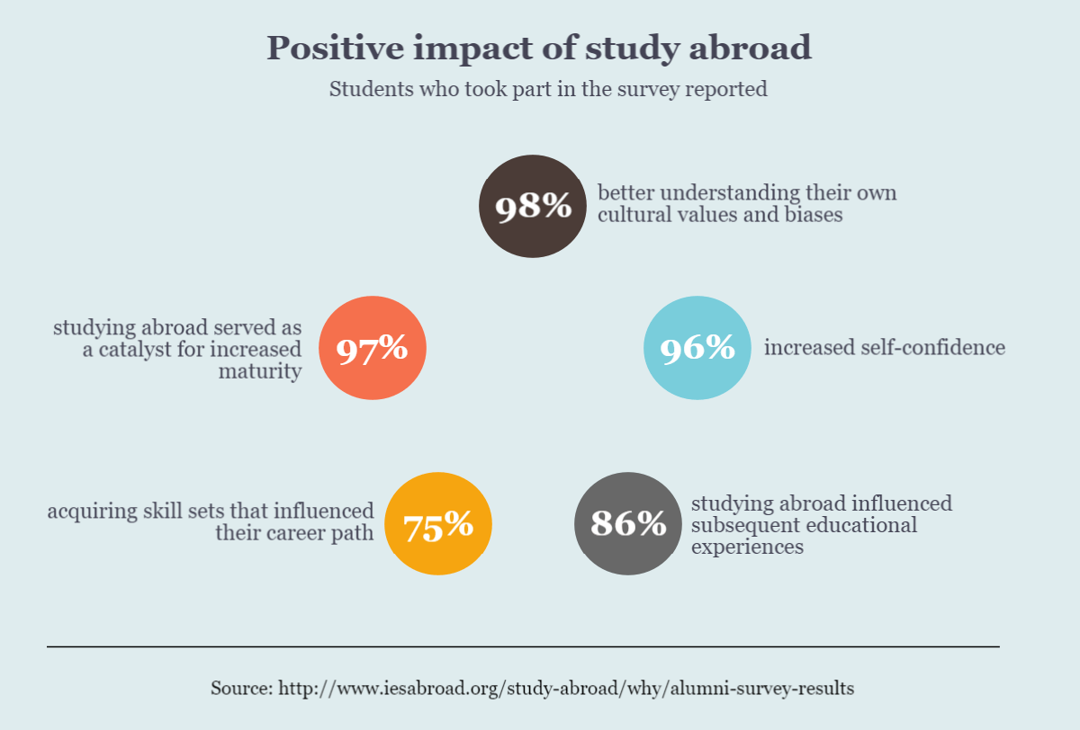 1. 接受调查的学生中,95%的人承认出国留学是提高成熟度的催化剂,96%的学生说他们的自信心增强了,95%的学生说这对他们的世界观产生了持久的影响。