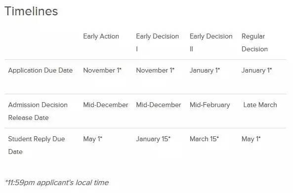 另外,芝加哥大学2017年本科申请还有一个变化:在原先EA的基础上,增加了ED1ED2的申请,申请截止时间如下图。