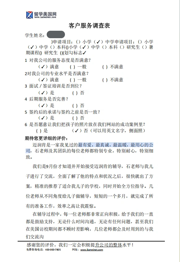 我们是9月份才知道并开始接受迈润肯的辅导,石老师与我儿子进行了交流,全面了解了他的特点和状况之后,很快就出了方案,精准的推荐了适合我儿子的学校,同时开始全方位指导。几位老师从不同角度给儿子做辅导,短短的一个多月,就完成了所有的准备工作,效率之高让我震惊。在辅导过程中,每一位老师都非常正向积极,给予我们的一直都是鼓励支持,无论什么时间沟通,无论有任何问题,甚至我们在美国访校期间都不顾时差影响,几位老师都会及时周到的与我们交流沟通。同时,各位老师给予孩子的指导并不仅仅是方式方法,更主要的是传递给孩子的是一种专业精神和做人做事的态度,这些都对孩子的成长有很大帮助。