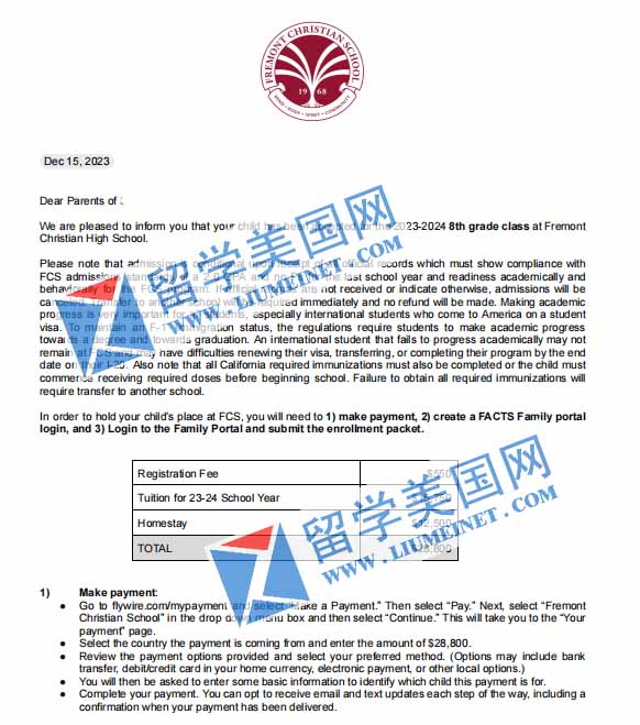 【录取喜报】恭喜留美网Y同学斩获Fremont Christian School录取offer!