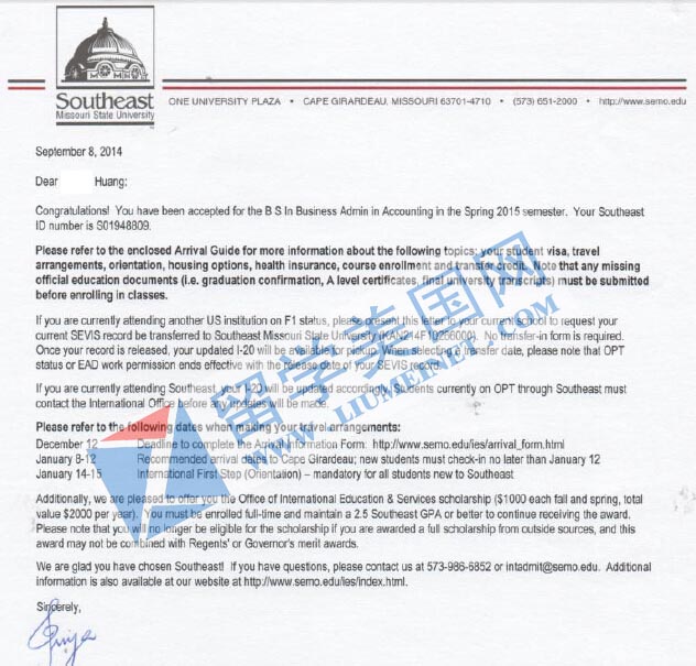 仔细分析后,我们发现黄同学在高中和社区学院的成绩还不错,另外她也准备好了托福。美国大学数千所,想找到合适的学校有如大海捞针。凭借我们丰富的经验,我们帮她找到并申请到了非常理想的学校。学生修的是会计专业,而东南密苏里州立大学的商科专业在全美排名前20%,而且我们还帮她申请到了奖学金.