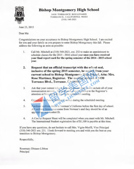 恭喜马同学获加州主教蒙哥马利中学录取!