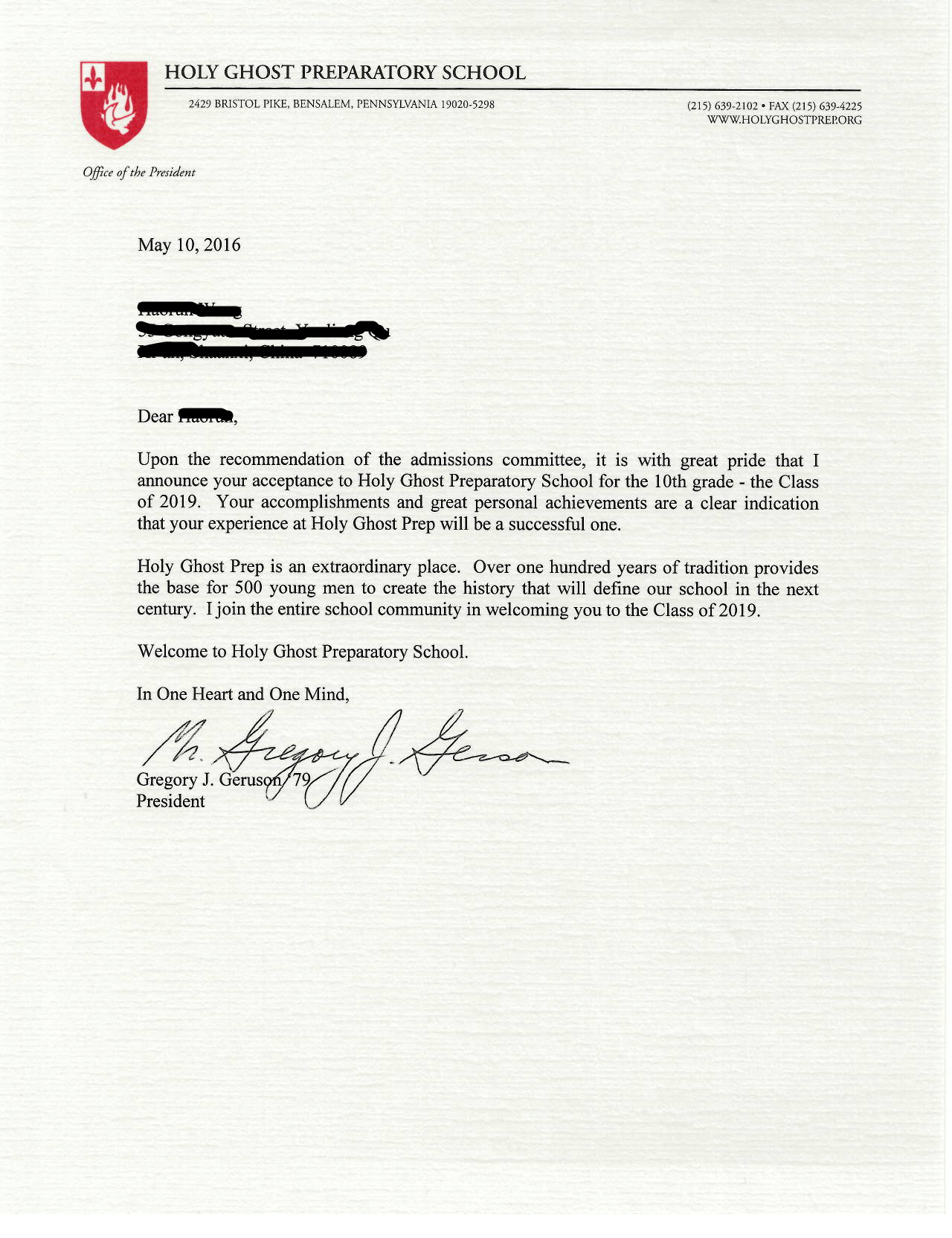 恭喜王同学获圣灵中学录取