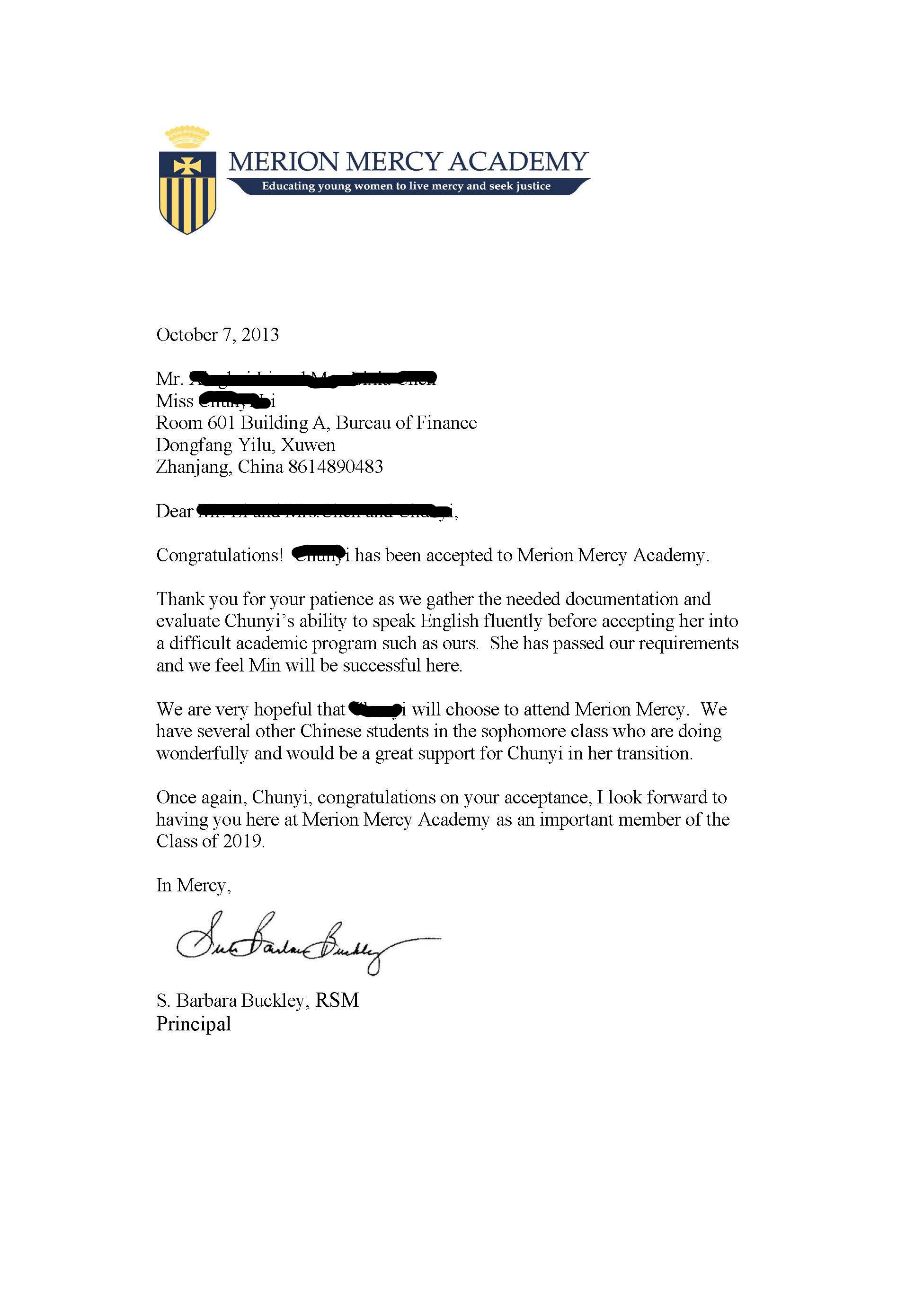 恭喜李同学被梅丽恩梅西学院录取
