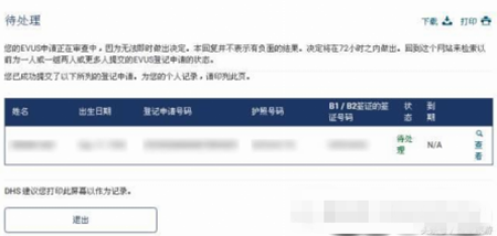 成功提交evus登记申请后,将转到待处理界面,72小时内出结果,建议打印此页并保存,以便之后查询使用。