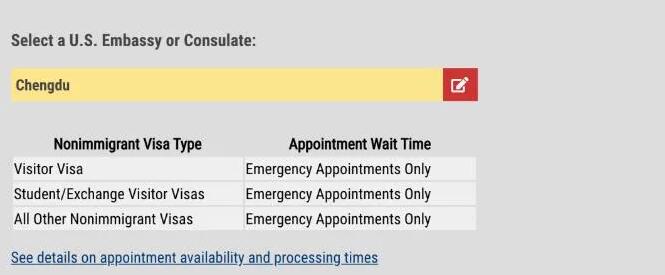 注:在美国大使馆或领事馆接受面谈预约的预估等待时间可能每周都在变动,会根据实际发生的工作量和处理人员数量而定。目前给出的只是预估时间,并不保证一定能得到预约。