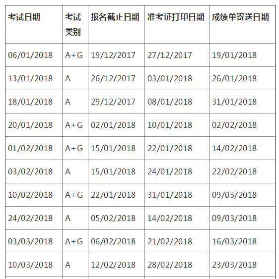 2018年1月至6月用于英国签证及移民的雅思考试报名截止日期、准考证打印日期和成绩单寄送日期