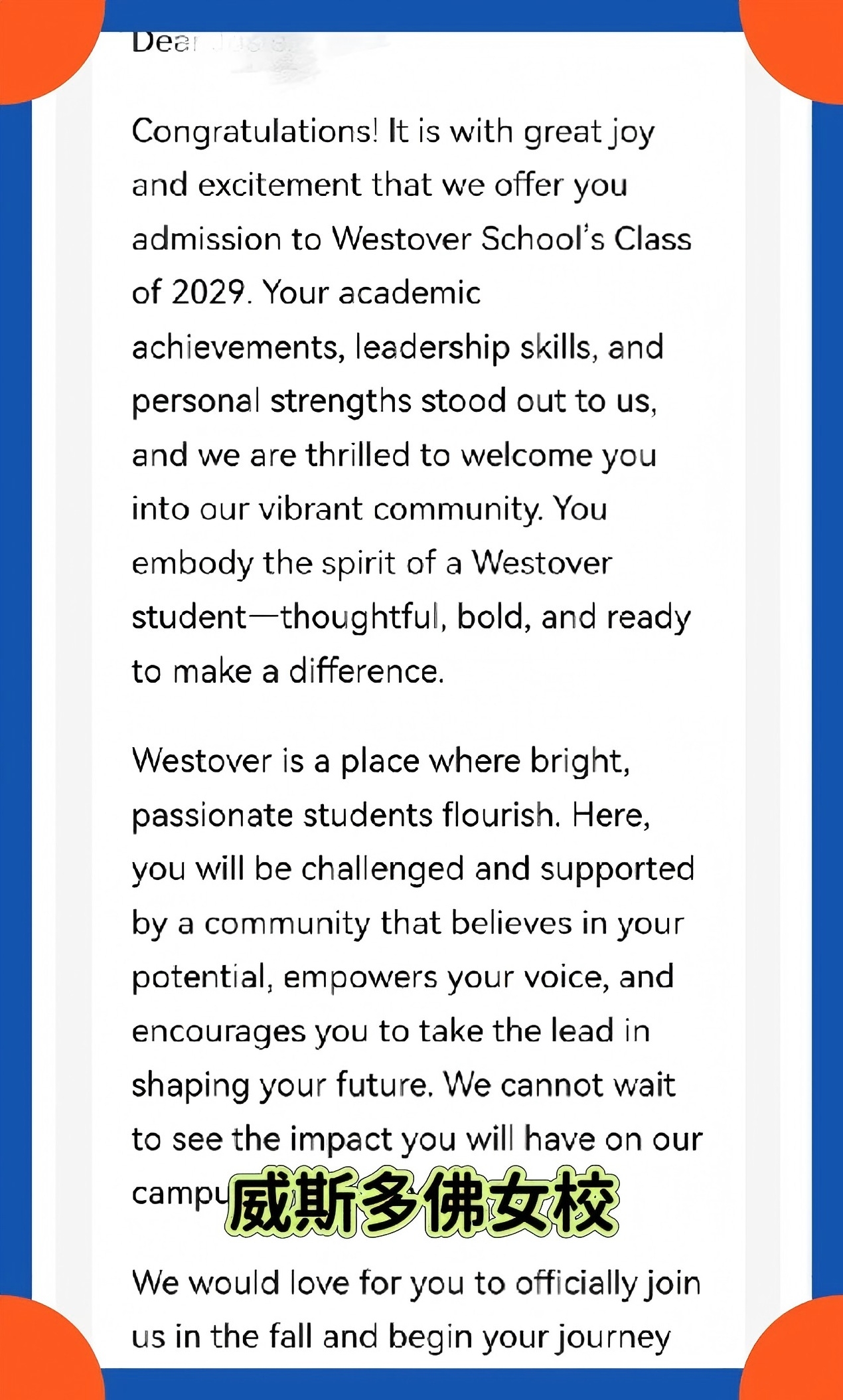 【录取喜报】恭喜留美网学子J同学斩获威斯多佛学校录取offer