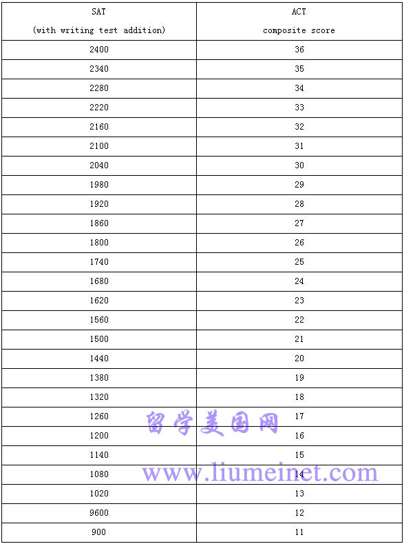 SAT是申请美国大学重要的标准化考试之一。除了SAT,美国的大多数大学都同时接受ACT的考试。近几年来,美国的越来越多的学生参加ACT的考试,ACT的考试人数已经和SAT的人数相当。那么SAT的成绩和ACT的成绩的关系是什么呢?在美国没有“标准”的对应。下面的转换表是根据多年的经验总结出来的,供大家参考。预祝学子们取得理想的成绩,进入理想的大学。