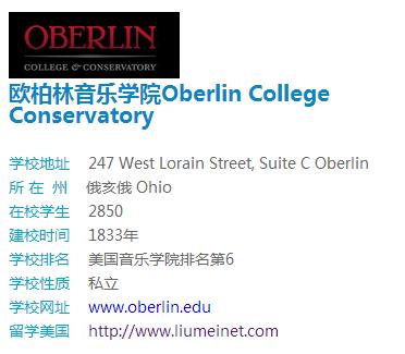 音乐学院:欧柏林音乐学院Oberlin  College是美国最好的音乐学院之一。成立于1865年的欧伯林音乐学院既是美国历史最悠久的音乐学院,也是美国第一家四年制大学学位的音乐教育机构,享有世界声誉。音乐学院收藏了超过1500把世界名家制作的乐器.全世界最早及美国唯一的全斯坦威学校,学校拥有207架斯坦威三角钢琴.它每年举办的活动众多,平均每年有500多场音乐会、演唱会和戏剧表演在校园内举办。每年举办的夏季音乐节吸引了来自世界各国的音乐家和乐迷。