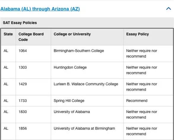 该页面之后的内容告诉你每个州的大学对写作的政策,标明了“要求”、“推荐”或“既不要求也不推荐”。因此,一定要查看该页面,确定你到底需要准备哪些考试内容。