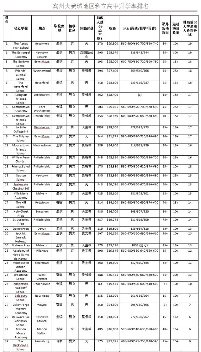 根据宾州费城非常有影响力的官网www.phillymag.com统计公布,以下学校是在费城大地区(费城市以及周边的小城市)的部份私立高中,以升入排名前20名大学的录取率人数的百分比来排名。从以下数据,大家可以看到大名顶顶的寄宿高中The Hill School(希尔高中) , Westtown School (西城高中)和 George School (乔治学校)的升学数据。
